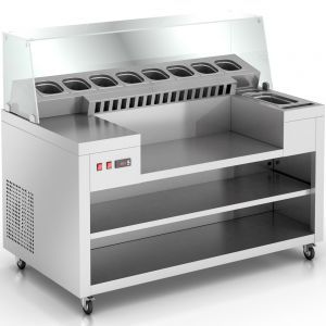 1730х850х1260мм, Блинная станция с охлаждаемой ванной. Модуль предназначен для приготовления и раздачи блинов и оснащён: стендом, закрытым с трех сторон;нишей размером 880х470х200мм под блинный аппарат с 2 жарочными поверхностями (аппарат не входит в комплектацию), 1 охлаждаемой наклонной ванной под гастроемкости 8хGN1/6 глубиной до 150мм. и гнёздами под ёмкости под масло (GN1/9) и тесто (GN1/3) (гастроемкости в комплект не входят), гнездом со специальной ёмкостью в комплекте под палочку для разравнивания теста, Станция также оснащена вытяжным вентилятором и фильтром. Модуль изготовлен полностью из нерж. стали, имеет четыре поворотные колеса с тормозами. По бокам имеет съемные поручни для передвижения модуля. Модуль имеет защитное остекление. Длина указана с учётом поручней (без поручней длина 1500мм.).