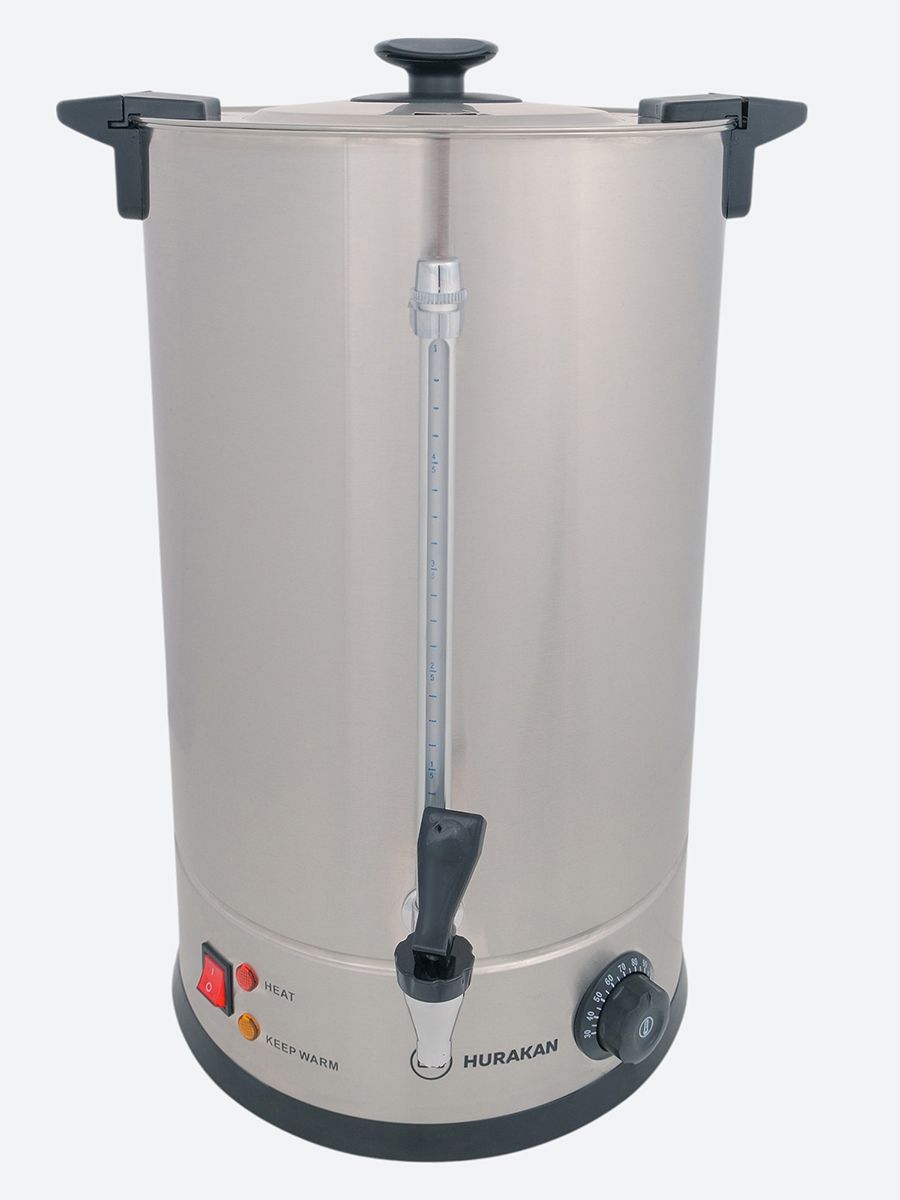 205*205*440мм, 1,8кВт, 220В, 2,6 кг, 5,7л (до отметки MAX), (габариты с ручками и краном 280х275х440мм), материал корпуса: нержавеющая сталь, пластиковый кран, двойные стенки, тип подачи воды: заливной, контроль уровня и температуры воды, индикаторы нагрева, закрытый тен