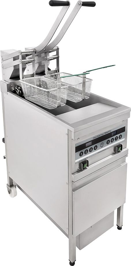 440x900x1150мм, Фритюрница электрическая с системой фильтрации масла на закрытом стенде с двумя ваннами объёмом по 12л каждая. Оснащена лифтами для корзин. Ванна имеет холодную зону объемом 1,7л для сгоревших частичек продукта. В комплекте две корзины из нержавеющей стали. Фритюрница оснащена ручным механизмом поднятия ТЭНов. Управление осуществляется с помощью контроллера ROBOTRON (производсвта РФ) который имеет 4 независимых режимов приготовления на каждую корзину. В комплекте с фритюрницей поставляются 10 фильтров. Мощность 17,5кВт. Напряжение 380V.
