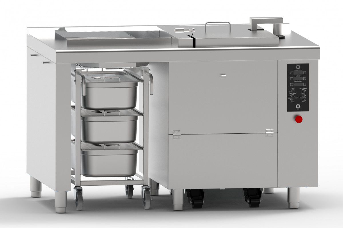 1413х911х964 мм Фритюрница электрическая ЭФК-35Л с автоподъемом корзины, ванна 35 л, 1 корзина GN 1/1 (530x325x150 мм), 1413х911х964 мм, +50…+190 С, 18 кВт, 400В, тележка на 3 GN 1/1 в комплекте, выкатная ванна для слива масла 35 л, вся нерж.