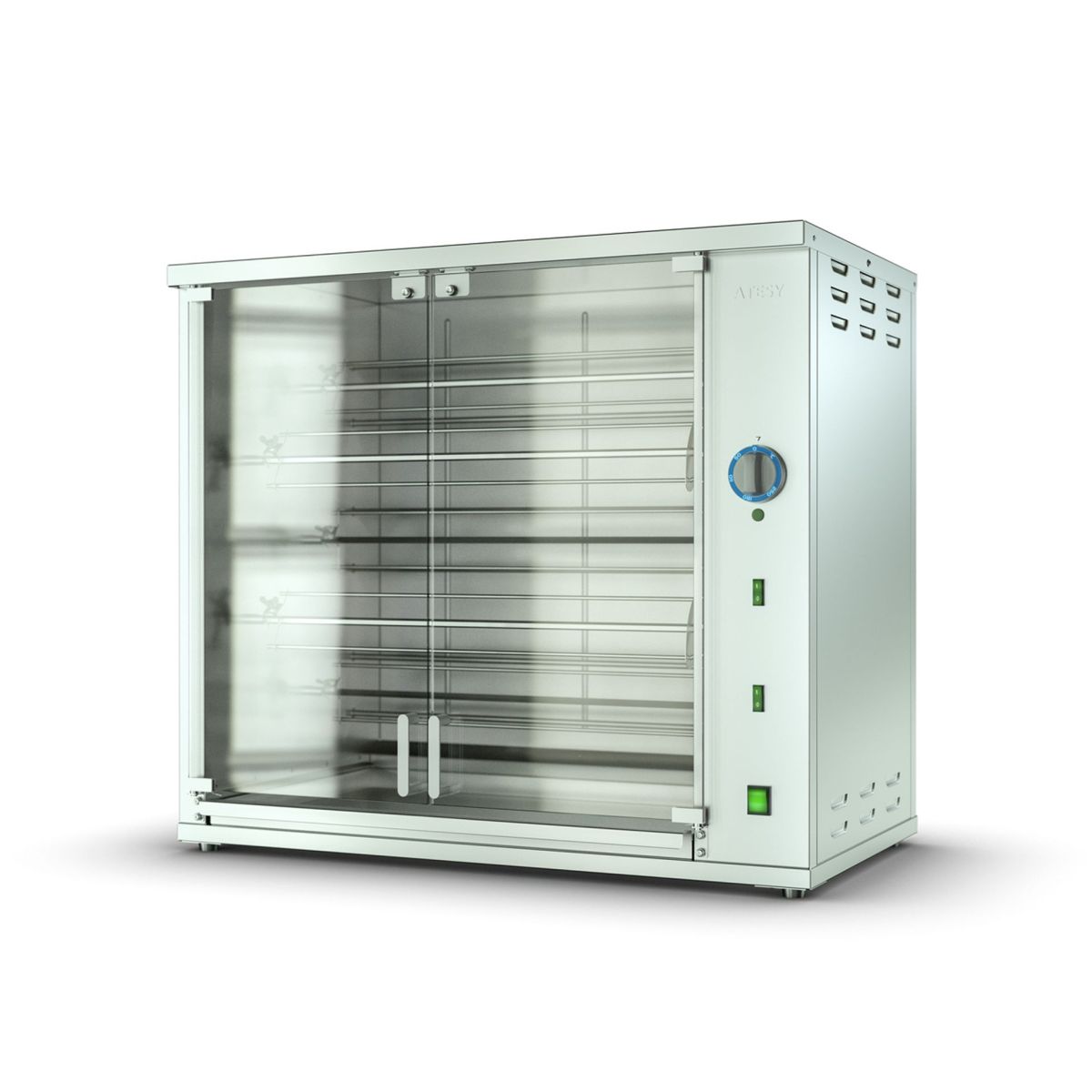 945х560х825мм, 7,3 кВт, 220 В, +50...+250С, шампурный, 5 вертелов (2 спереди, 3 сзади), на 25 кур