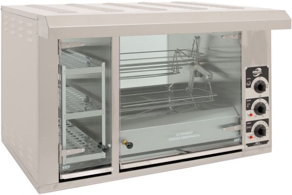 850*650*580мм, Гриль для кур электрический карусельный, 1 камера, загрузка 8 кур, нерж.сталь, электромех.управление, крыша с подсветкой, тепловая витрина. В комплекте вертел съемный, 4 люльки-корзины, поддон, кассета витрины, поддон витрины
