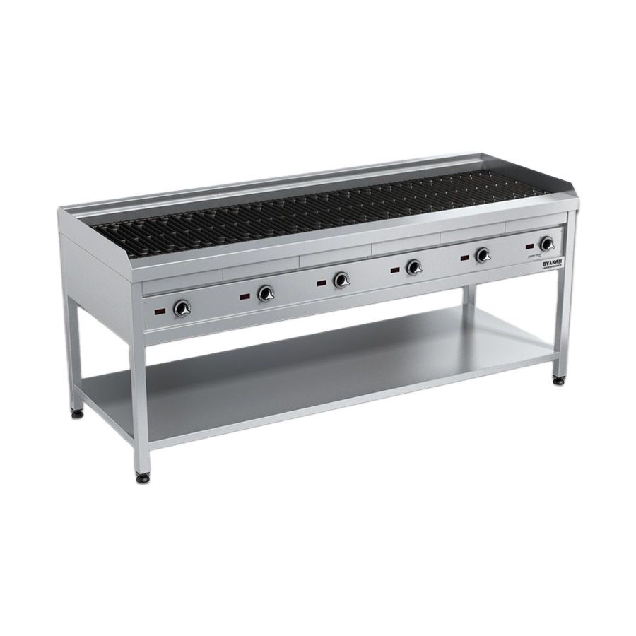1900х700х850 мм, Материал рабочей зоны: чугунная решетка, Мощность, кВт: 27 (с 6 зонами нагрева по 4,5 кВт), Питание, В: 380, C лавовыми камнями