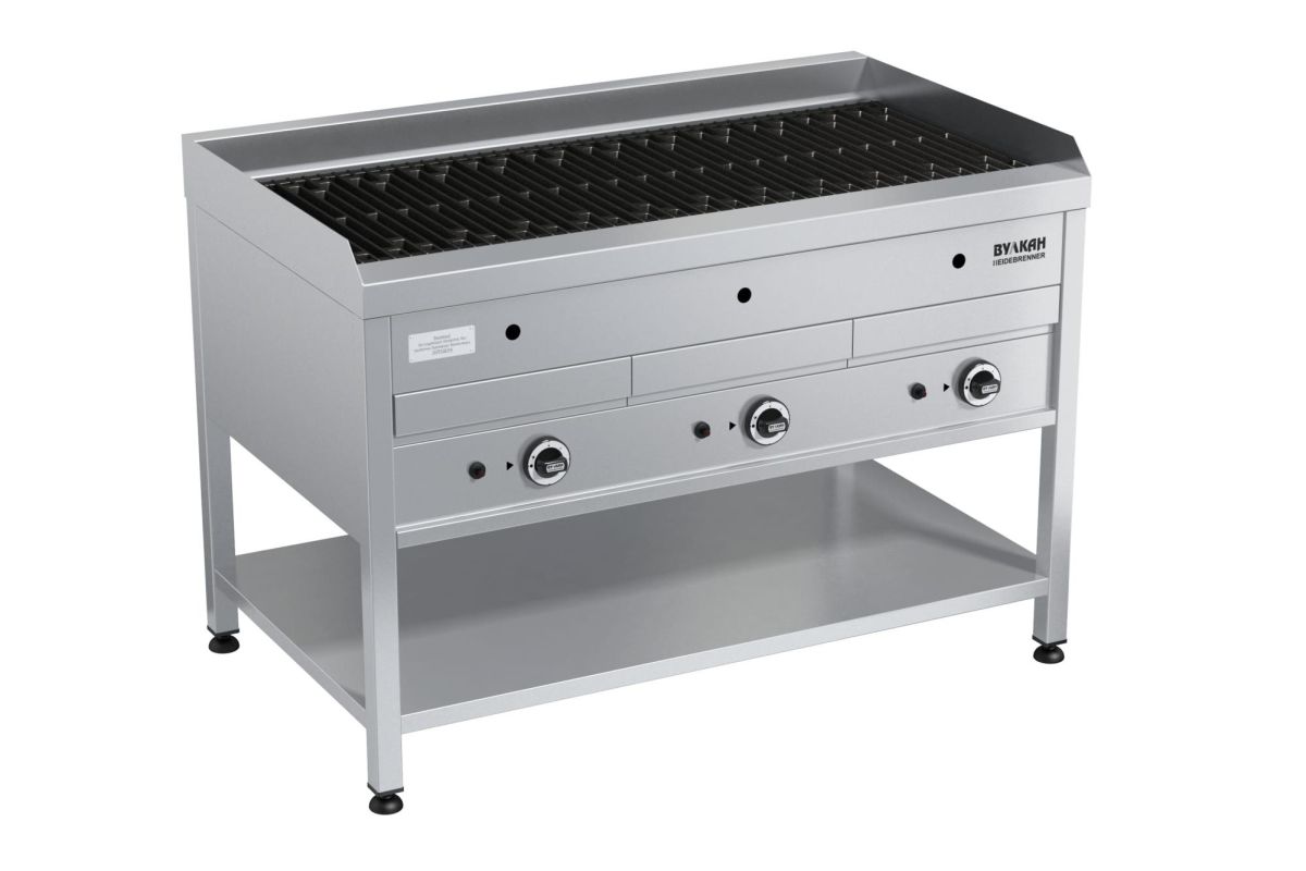 1200х700х850мм, BPD 03V "Омолон" , 3х12,1кВт. Расход газа: прир (сжиж)-3,68(2,87)м3?ч (кг/ч). Высота мангала-100мм, защитный борт-50мм, рабочая зона 1190х475мм, Напольный газовый водяной гриль из нержавеющей стали с 3-мя зонами нагрева. Отличительная черта – наличие поддона с водой. Испаряющаяся вода создает эффект водяной бани, благодаря чему продукты не только равномерно прожариваются, но и приобретают необыкновенную сочность и мягкость. Использование воды снижает образование дыма и чада. Для качественной прожарки и получения рельефного узора используются чугунные решетки, обладающие отличными антипригарными свойствами. Газконтроль, запальная горелка, пьезоподжиг, поддон для сбора жира, работа на природном или сжиженном газе.