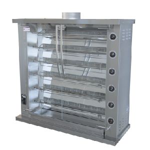1280х517х1290мм, Рамная конструкция, цепная передача вращения шампуров, полный газ.контроль. Гриль на 30 тушек, 6 шампуров в один ряд, выполнен полностью из нержавеющей стали, готовит курицу за 55 минут, 6 газовых кранов с ситемой газ-контроль, настроен на пропан