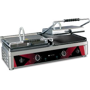 820х500х300 мм, 230В, 2,5+2,5 кВт, две независимые зоны: 1-я верх рифленый, низ гладкий (RS), 2-я верх рифленый, низ гладкий (RS), чугун, размер поверхностей 2х360х270 мм, термостат 50- 300C, корпус из нержавеющей стали, емкость для сбора жира