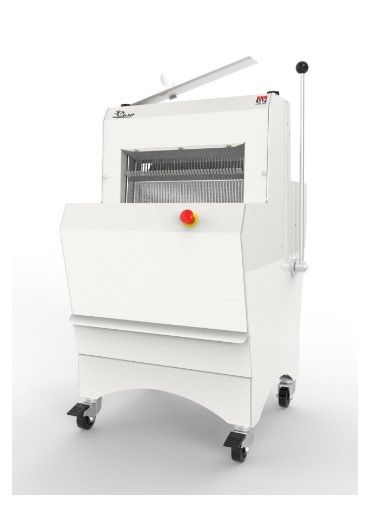 663*760*1243 мм, 0,49 кВт, 380В/3Ф, напольная полуавтоматическая модель, нож стальной 13*0,5мм, максимальный размер изделия для нарезки 440*320*160 мм, высота толкателя 80 мм, цвет - белый. Для нарезки ломтиками 13 мм. Производительность до 200 нарезок/час. Рычаг плавной тяги обеспечивает более качественное управление усилием. Съемный бак для сбора крошек емкостью 18 л. Устройство для расфасовки в пакеты облегчает упаковку хлеба.