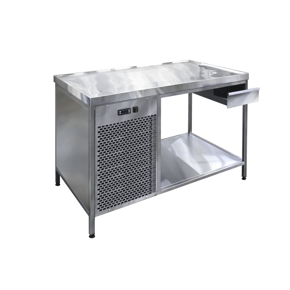 Среднетемпературный холодильный стол открытый предназначен для разделки полуфабрикатов мяса и рыбы, так же может использоваться для демонстрации и выкладки продуктов. Столешница холодильного стола, охлаждаемая, с бортиками по периметру, предотвращающими стекание жидкости на пол. В углу стола имеется дренажное отверстие для стока жидкости в лоток.Внизу стола расположена окрытая полка для хранения инвентаря. Предусмотрена возможность регулировки ножек по высоте для удобства работы. Технические характеристики: Температурный режим +2...+7,°С Микропроцессорный блок управления Компрессор Aspera, ACC, Electrolux, l'unite hermetique Напряжение питания: 220В/50Гц Автоматическая оттайка испарителя Столы выполнены полностью из нержавеющей стали Повышенная прочность столешницы холодильного стола