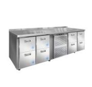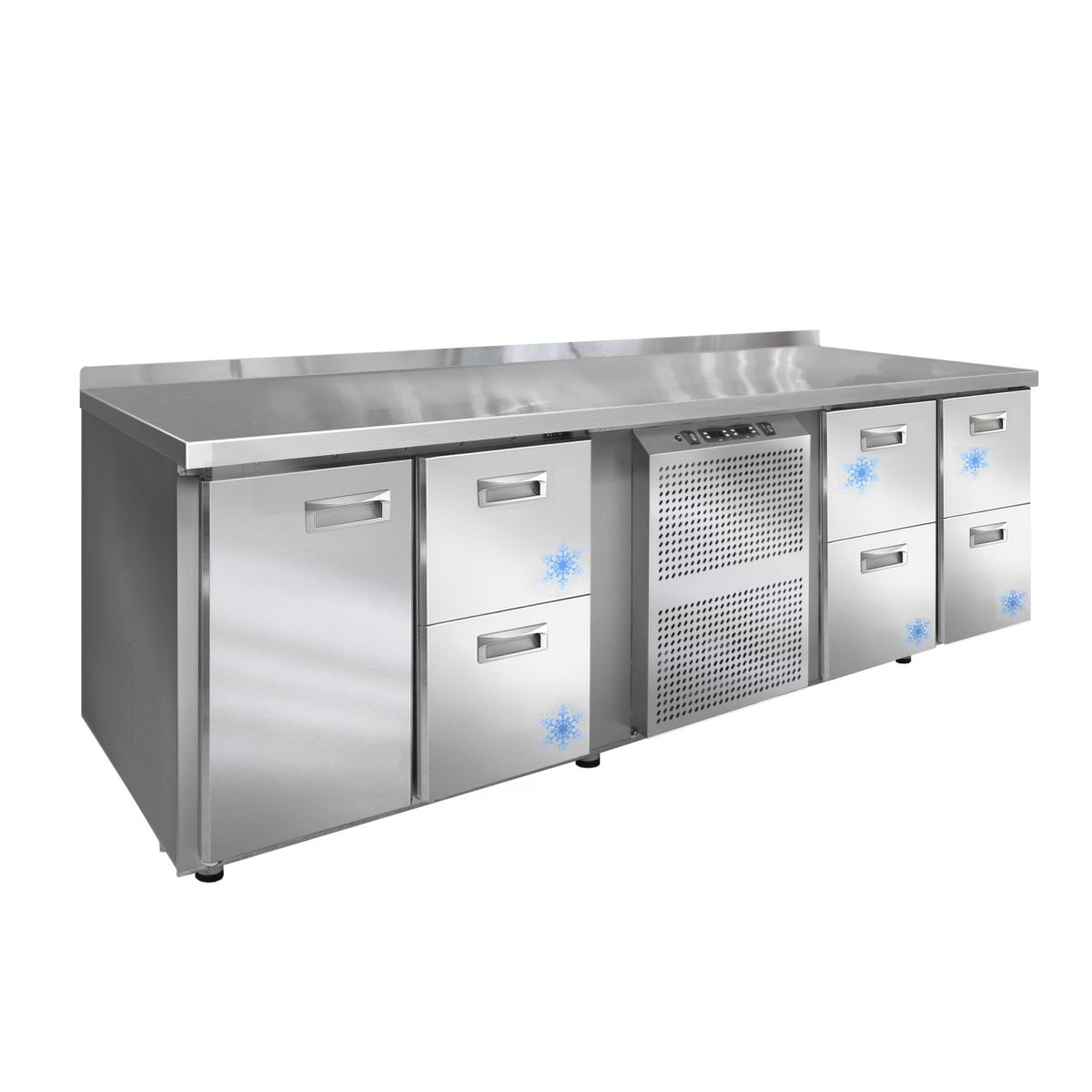Комбинированные холодильные столы призваны в рамках ограниченного пространства кухни уместить холодильный и морозильный объём для хранения полуфабрикатов и заготовок. Конструкция комбинированного холодильного стола включает две рабочие камеры с независимым управлением для хранения продуктов. Одна создает температуру от -2◦С до +8◦С. Вторая – -10…-18◦С. На передней панели отделения для холодильного агрегата предусмотрена перфорация. Благодаря этому воздух свободно может циркулировать, что обеспечивает эффективное охлаждение компрессора. Двери оборудуются доводчиками. Технические характеристики: Температурный режим: камера 1: -2...+8,°С, камера 2: -10...-18°С Компрессор Aspera, Electrolux, l'unite hermetique Микропроцессорный блок управления Динамическое охлаждение Напряжение питания: 220В/50Гц Автоматическая оттаика испарителя Столы выполнены полностью из нержавеющей стали Цельнозаливной корпус Повышенная прочность столешницы холодильного стола