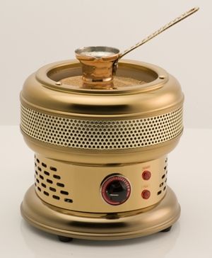 210х210х195 мм, 2,94 кг, 220 В, 0,6 кВт, для одной турки. в комплекте песок(560г)+1турка(100мл); d=210мм; h=195мм, медь + латунь , температура 300*С. Цвет - золото; время приготовления кофе 2,5-3 минуты