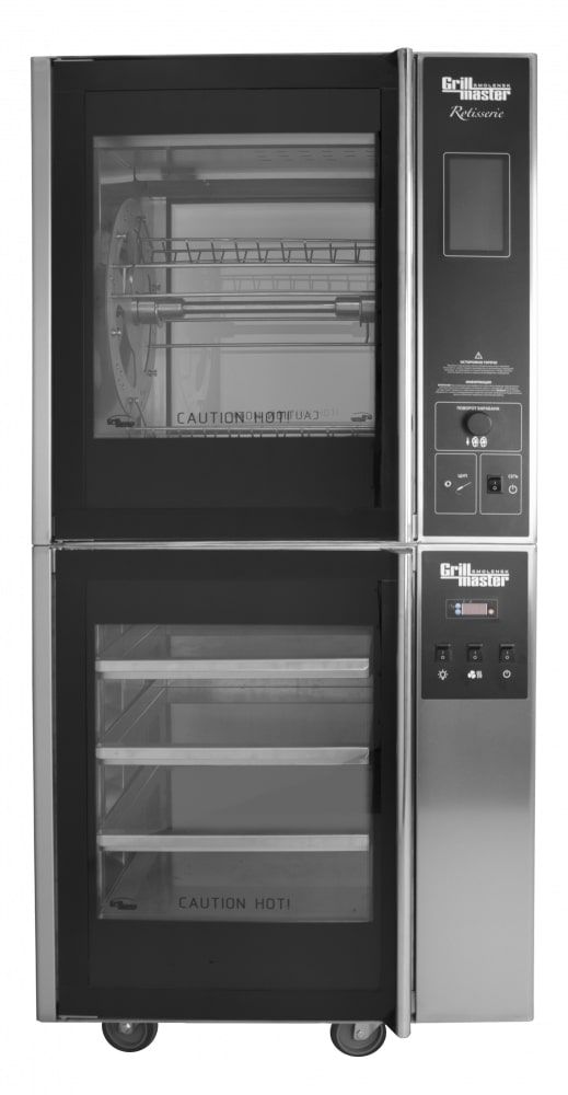 830х780х1790 мм, Установленный в единую колонну гриль-витрина с пароувлажнением. Премиальная версия гриля, 6 спиц для одновременного приготовления 24 тушек (до 2 кг), 6 корзин для кур и субпродуктов(опция), 6 угловых шампуров для кур (опция), возможно одновременное использование корзин и спиц для приготовления, мощный вентилятор конвекции, яркая галогенная подсветка камеры, электронная сенсорная панель управления с функцией программирования, 3 программируемых режима приготовления, редактируемые программы приготовления с 4 шагами выполнения, термощуп, сквозной доступ в камеру гриля и витрины (2 двери), стекла гриля и витрины с теплоотражающим покрытием, полностью из н/стали c черным покрытием, температурный режим 50-250С, установлен на витрину с конвекцией и пароувлажнением (4 противня в комплекте) 13.1 кВт+ 3 кВт, единое подключение 380В, г.нетто 830х780х1790мм, поставляется 2 местами, масса брутто 420кг