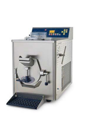 560x898x795 мм, 220 В, 3,7 кВт, 105 кг. Комбинированный фризер-пастеризатор для приготовления мороженого и кондитерских кремов. Фризер (нижний цилиндр): загрузка за цикл 1,15-3,7 кг, производительность 15 кг/час (20 л/час). Пастеризатор (верхний цилиндр): загрузка за цикл до 4 кг, нагрев до +115C, охлаждение до +4C, внутренний канал перелива во фризер. Мешалки сталь AISI 304, саморегулирующиеся скребки, регулируемая скорость вращения. Электронный контроллер, 32+32 программы, инвертор. Функция размораживания цилиндра. Воздушное охлаждение конденсатора. Корпус нержавеющая сталь.