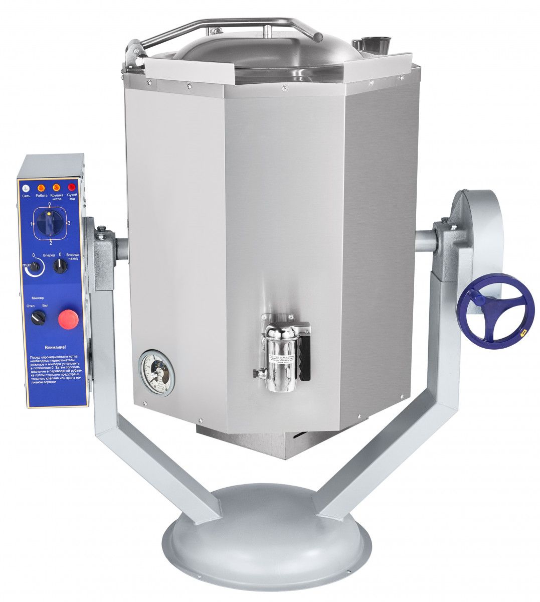 1036х759х1163(1614), Котел пищеварочный электрический КПЭМ-60-ОМР со сливным краном, 60 л, миксер 0-120 об/мин (плавная регулировка, нижний привод, реверс), +100С, пар. рубашка, ручное опрокидывание, цельнотянутый