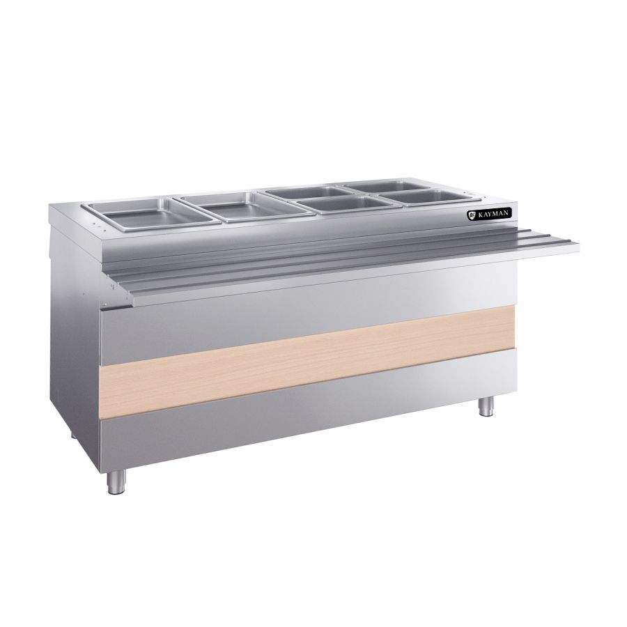 1500х1015х880 20мм, 220В, номинальная мощность подключаемого оборудования 4,2 кВт. Предназначен для поддержания в горячем состоянии гастроемкостей со вторыми блюдами, гарнирами и соусами.Вес 100кг.Возможна модернизация в передвижной модуль при помощи комплекта колес.Конструкция сборная, бескаркасная. Столешница AISI430 и усилена ЛДСП 16 мм. В столешницу установлена герметичная ванна размером 1310х510х180 мм, выполненная из нержавеющей стали. В ванне расположены ТЭНы мощностью 1,2 кВт – 2шт. Тип подогрева гастроемкостей — паровой. Вода в ванну заливается сверху вручную. В ванну могут устанавливаться гастроемкости GN 1/1 максимальной глубиной 150 мм - 4шт. Чтобы установить в ванну гастроемкости GN 1/2, 1/3, в комплект поставки входят съемные перемычки из нержавеющей стали П-образной формы. В гастроемкостях можно поддерживать t max +80С. Регулировка температуры нагрева гастроемкостей осуществляется терморегулятором. Ножки модуля выполнены из нержавеющей стали.