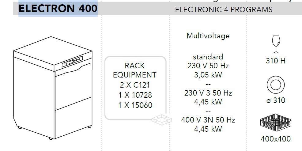 460x550x780мм, 220В, 3,05кВт, кассета 400*400мм, 4 программы, Корзин/час: n. 60/40/30/20, подходит для мытья бокалов до 310 мм, тарелок до 310мм. Кассеты/аксессуары в стандартной комплектации 2XC121 - 1X10728 - 1X15060. Объем бойлера 5л, ТЭН бойлера 2,8кВт, потребленые возы за цикл 1,8 л. Дозаторы моющего и ополаск. средств в стандартной комплектации. Уровень шума 59.90.7 dB(A)