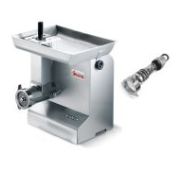 470x220х440 мм, 1,1 кВт, 380В, 300 кг/час, реверс, система UNGER (подрезная решётка, нож, решётка, нож, решётка), диаметр отверстий в решётках 6 мм и 10 мм, ножи со сменными лезвиями, мясорубочная часть и шнек - нержавеющая сталь, ножи и решётки - нержавеющая сталь, лоток и горловина - нержавеющая сталь. Диаметр загрузочной горловины для продукта 52 мм, диаметр горловины шнека и диаметр решеток 82 мм. Просторный корпус обеспечивает лучшее охлаждение при интенсивной нагрузке