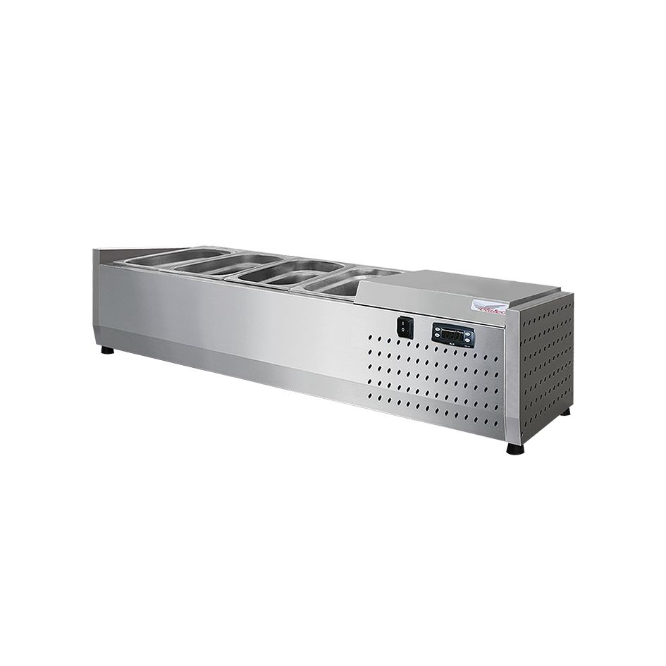 Холодильная настольная витрина ToppingBox открытая предназначена для демонстрации и кратковременного хранения подготовленных начинок/топпингов (для пиццы, блинов, лапши WOK), а также мясных изделий и полуфабрикатов на предприятиях быстрого питания и торговли. Пониженная температура позволяет в течение длительного времени сохранять вкусовые качества, внешний вид и структуру продуктов. Витрина оснащена статическим охлаждением. Технические характеристики: Температурный режим: +2...+7°С Микропроцессорный блок управления Компрессор: Aspera, ACC, Electrolux, l'unite, hermetique Мощность: 0,13кВт Потребление электроэнергии за сутки: до 1,04кВт/сут(зависит от условий эксплуатации) Статическое охлаждение Напряжение питания: 220В/50Гц Автоматическая оттайка испарителя Цельнозаливной корпус