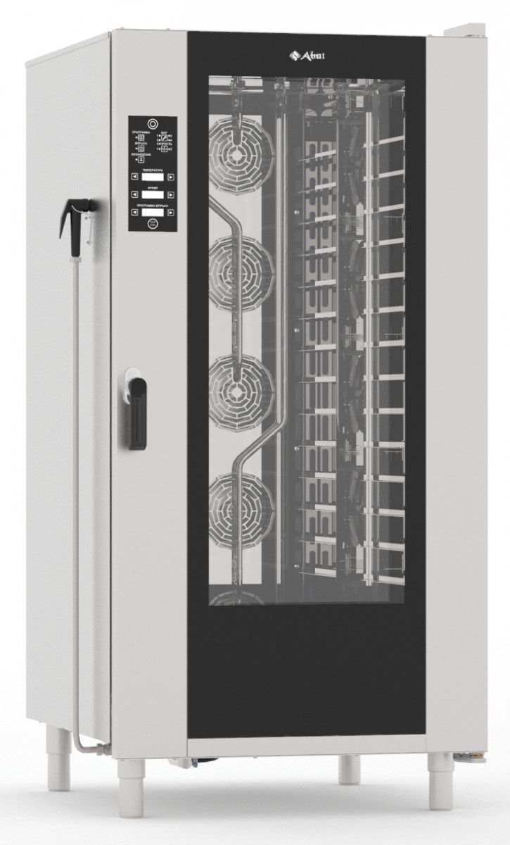 Конвекционная печь КЭП-16, стационарные направляющие на 16 уровней 400х600 мм, нерж. камера, пароувлажнение - инжекция, 2 скорости вращения вентиляторов, память на 110 программ, до 4-ех этапов в программе, ручной душ в комплекте, без противней, корпус нерж.