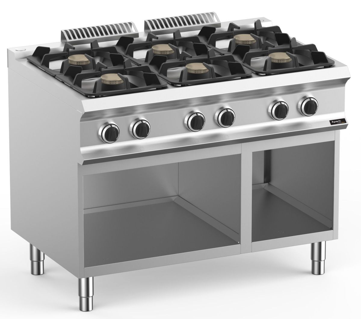 1200х900х850 мм, 113 кг, газ 54 кВт, 6 конфорок 375х372 мм, на открытой подставке