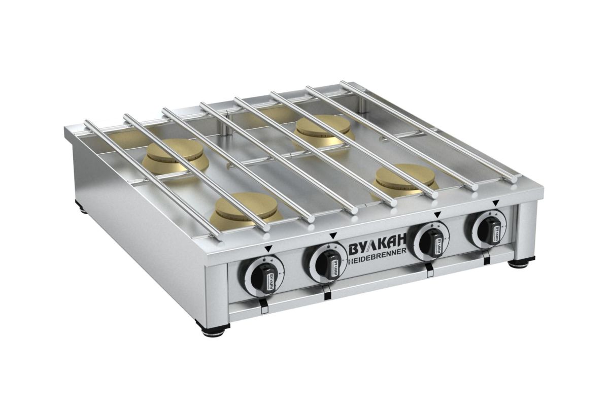 600х650х150мм, Ультратонкая настольная газовая плита из нержавеющей стали, Возможно одновременное размещение 4 кастрюль объемом 30 л, 4 латунные горелки по 6 кВт каждая, 2 съёмные решетки из нержавеющей стали, газконтроль, работа на природном или сжиженном газе, 4x4,0кВт, Расход газа: прир (сжиж)-1,62 (1,26)м3?ч (кг/ч), Брутто: 37кг