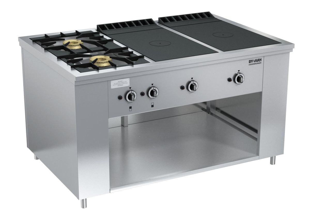 1470х990х850мм, Плита из нержавеющей стали с 2-мя двухрядными горелками и 2-мя варочными чугунными поверхностями. Открытые горелки имеют массивные чугунные решетки размером 430х430 мм, что позволяет размещать на них гастроемкости объемом до 50 л, съёмная подконфорочная емкость. Под чугунными настилами располагаются мощные горелки, быстро и равномерно нагревающие всю поверхность рабочей зоны, благодаря чему на них можно разместить как крупные гастроемкости, так и множество мелких. В нижней части плиты имеется ниша для хранения кухонного инвентаря. Газконтроль, запальные горелки, пьезоподжиг каждой горелки, работа на природном или сжиженном газе. Ножки плиты регулируются по высоте, 2х8,0кВт+2х10,0кВт. Расход газа: прир (сжиж)-3,74 (2,91)м3?ч (кг/ч) Брутто: 243кг