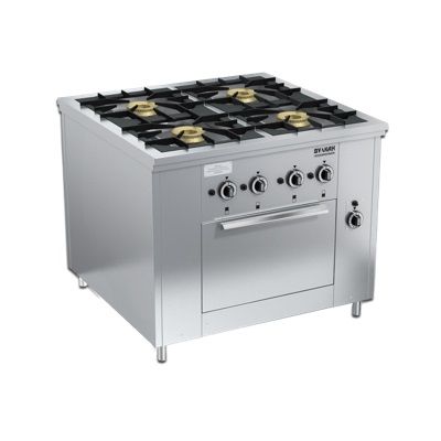 1945х990х850мм, Плита с 4-мя латунными двухрядными горелками, каждая имеет массивную чугунную решетку размером 430х430 мм. Съёмная подконфорочная емкость. В нижней части плиты-жарочный шкаф с диапазоном температур 110-325С. Газконтроль, запальные горелки, пьезоподжиг каждой горелки, работа на природном или сжиженном газе. Ножки плиты регулируются по высоте, 4x8,0кВт+ДШх8,0кВт. Расход газа: прир (сжиж)-4,17 (3,24)м3?ч (кг/ч) Брутто: 185кг
