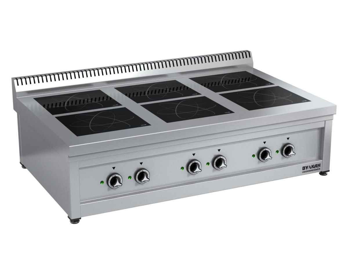 1200х700х320мм, Индукционная настольная плита из нержавеющей стали имеет 6 мощных конфорок по 5кВт, выполненных из прочного стекла SCHOTT CERAN или EURO KERA. Мощность регулируется чувствительным 16-позиционным переключателем. Оснащена умной системой распознавания посуды, 6х5кВт, конфорка: 310х270см, толщина-4мм, питание: 380В