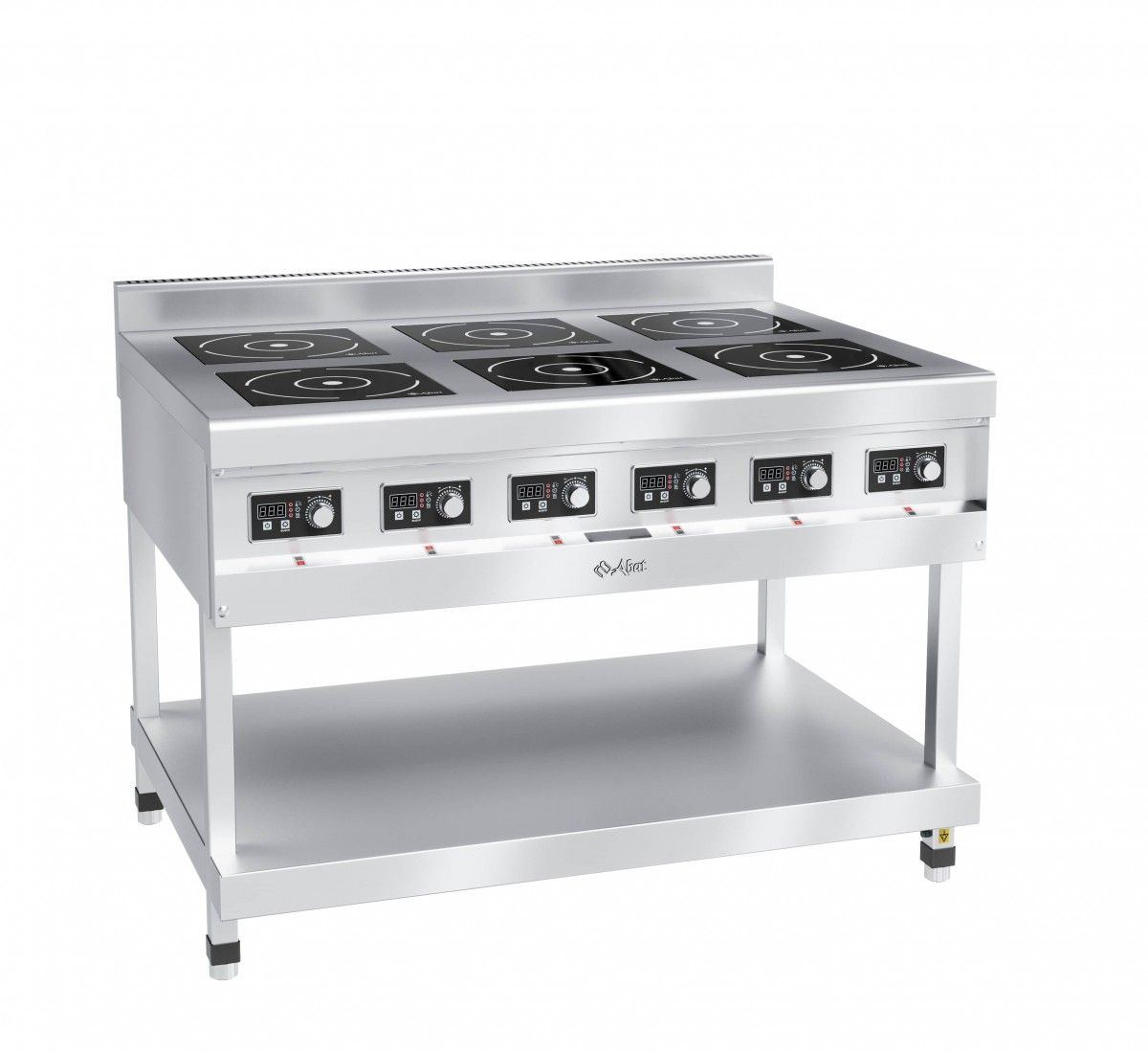 1220х900х940(960)мм, Плита индукционная 6-ти конфорочная КИП-69П-3,5-01, нерж. сталь, 1220х900х940 мм, 9 ур. мощности, +60…+240 С, 21 кВт, 400 В, 6 независимых индукторов, стеклокерамика 6 мм, 2 жироулавливающих фильтра, защита от перегрева