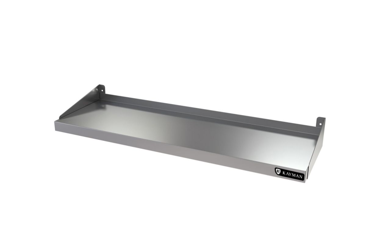 Габариты 1500х300мм, максимальная равномерно распределенная нагрузка 25кг, материал нержавеющая сталь AISI 430 0,8мм. Полка имеет борт, защищающий стеновые панели от воздействия влаги в моечных отделениях,-А также предохраняющий от попаданий продуктов на стену и в щель между стеной и полкой. Полки настенные кухонные предназначены для хранения и временной расстановки посуды, кухонного инвентаря, специй, продуктов в упаковке и пр. Края полки имеют подгиб для предотвращения травматизма персонала. Полки имеют универсальную конструкцию крепления бокового кронштейна. Благодаря этому, в зависимости от использования, боковые стенки могут крепиться как уголком вверх, так и уголком вниз. Такая конструкция боковой стенки позволяет выстраивать любые конфигурации. Полки крепятся на стене с помощью дюбелей и шурупов, входящих в комплект полки. Вес 4,5кг.