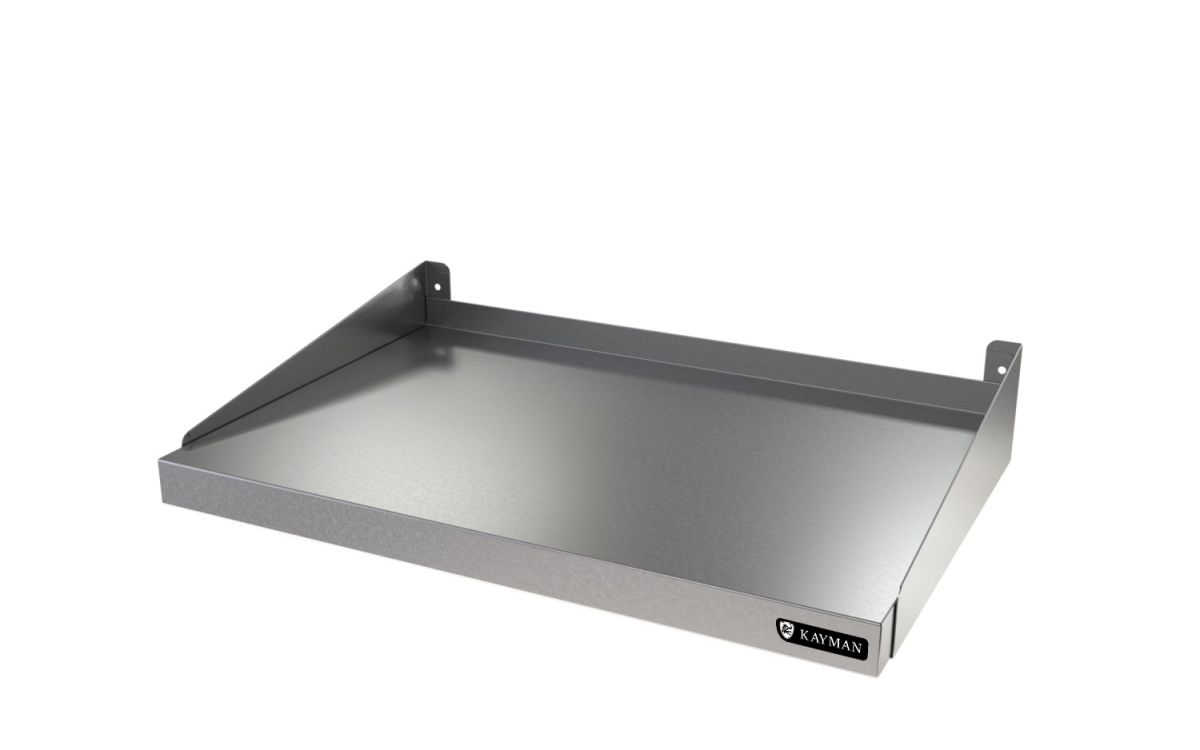 Габариты 400х500мм, максимальная равномерно распределенная нагрузка 25кг, материал нержавеющая сталь AISI 430 0,8мм. Полка под СВЧ печи, имеет борт, защищающий стеновые панели от воздействия влаги в моечных отделениях,-А также предохраняющий от попаданий продуктов на стену и в щель между стеной и полкой. Полки крепятся на стене с помощью дюбелей и шурупов, входящих в комплект полки. Вес 3,2кг.