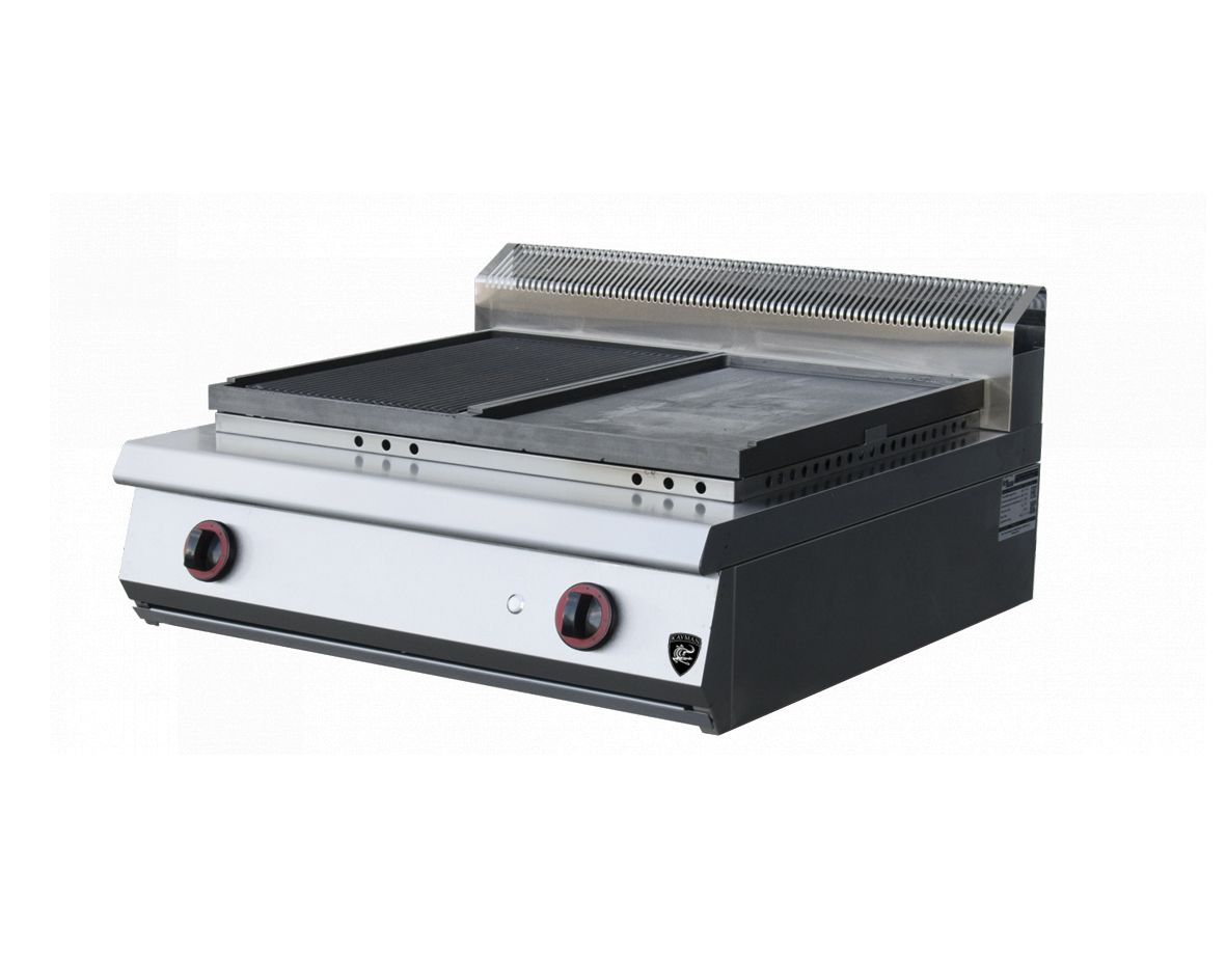 800x800x340, 93 кг, 2 жарочные поверхности (гладкая, рифленая) из чугуна, 2 пакетных выключателя(4 позиции), рабочая температура ~300C, мощность 6 кВт, исполнение полностью из нержавеющей стали, габариты брутто 900х900х600