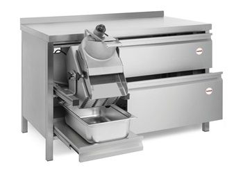 1300х700х900, 380В, 0,95/1,1кВт, 2 скорости, 150-300кг/час, настольное исполнение (привод встроенный в стол слева или справа), 2 ящика под GN1/1-150, с таймером 1-60 мин
