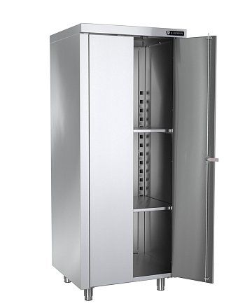 800х600х1730мм, кол-во полок 2шт., нагрузка на полку 30кг. Материал шкафа нержавеющая сталь AISI430 0,8мм. Материал дна и задней стенки шкафа оцинкованная сталь 1,2мм, распашные двери с замком. Регулировка опорных ножек 20мм. Вес 75кг. Сборная бескаркасная конструкция. Дно и задняя стенка изготовлены из оцинкованной стали. Внутри шкафа расположены две полки. Конструкция шкафа позволяет изменять высоту полок с шагом 100 мм. Предназначен для использования в различных цехах предприятий общественного питания: - моечные отделения: для кратковременного и длительного хранения посуды, баков, котлов; - кладовые: для хранения сухих видов продуктов; - специализированные цеха (горячие, салатные, мясные и т. д.), где требуется размещение посуды или продуктов в непосредственной близости от рабочего места повара.