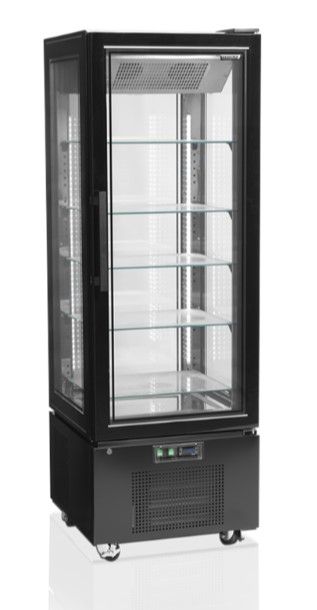 650 x 650 x 1950мм, 1 кВт, 220В, -22 ...-18 C, 203 кг, объем полезный 248л., стекло с 4-х сторон, светодиодная подсветка, вентилируемое охлаждение, 5 полок, цвет черный