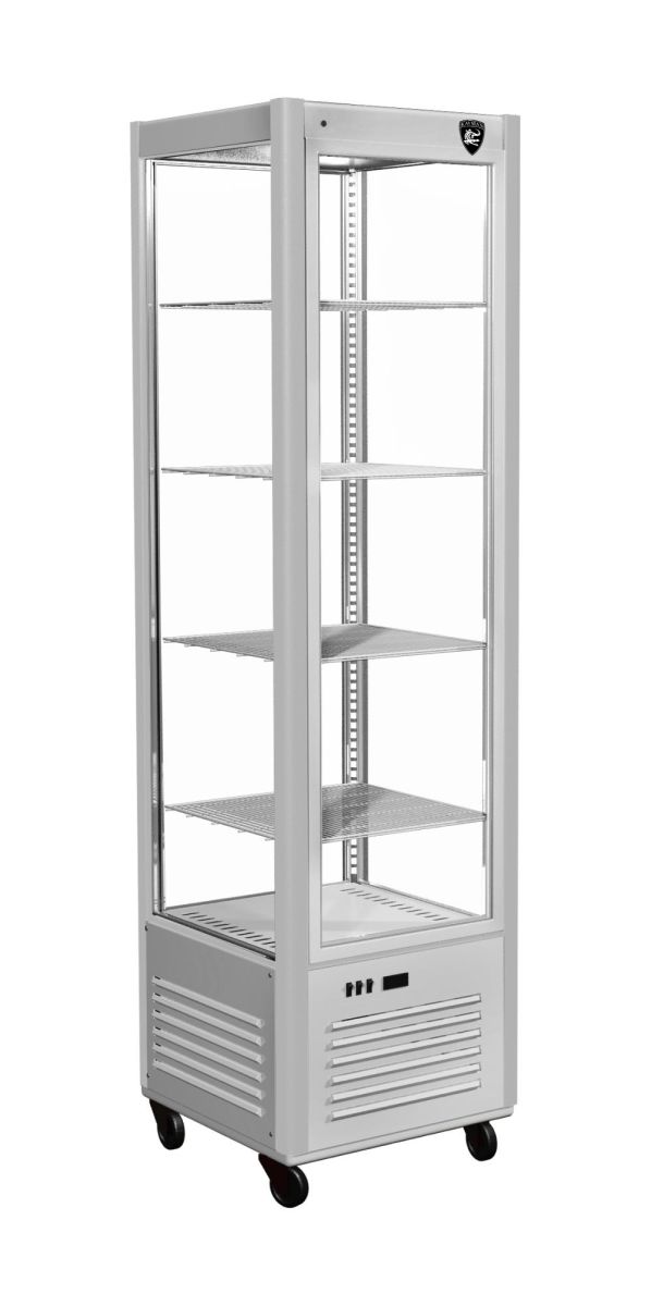 600х575х1850(1950)мм, +6+12С,цвет LED подсветки-теплый белый по двум боковым стойкам, вентилируемые, 4 полки решетки, цвет нержавейка, колесные опоры высотой 100 мм, 220В, 0,4кВт, R290