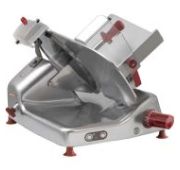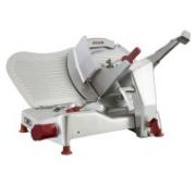 Диаметр ножа 350 мм, Передача редукторная, ручной, толщина нарезки 0-14 мм. Компактный слайсер для профессионального использования для интенсивной работы в супермаркетах и на небольших производствах. Детали из алюминия и нержавеющей стали, корпус выполнен из анодированного алюминия, ручки выполнены из пластика. Специальная форма корпуса позволяет жидкости и грязи собираться в одном месте, что облегчает очистку. Встроенное заточное устройство.
