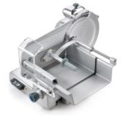 Габариты 620 x 480 x H 590 мм. Диаметр ножа 300 мм, рез 245 x 220 мм. Автоматический слайсер для нарезки мяса, сыра, колбасных изделий и других продуктов питания. Толщина нарезки 0-15 мм. Нож из хромированной стали, корпус из лакированного алюминия с пластиковыми деталями. Фиксированное заточное устройство. Версия DOM