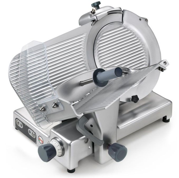 840х570х595мм, Дисковый нож 350 мм. Толщина нарезки 0 - 23мм, ход каретки 355 мм, лоток - 330x307мм. Доступен только в СЕ версии исполнения