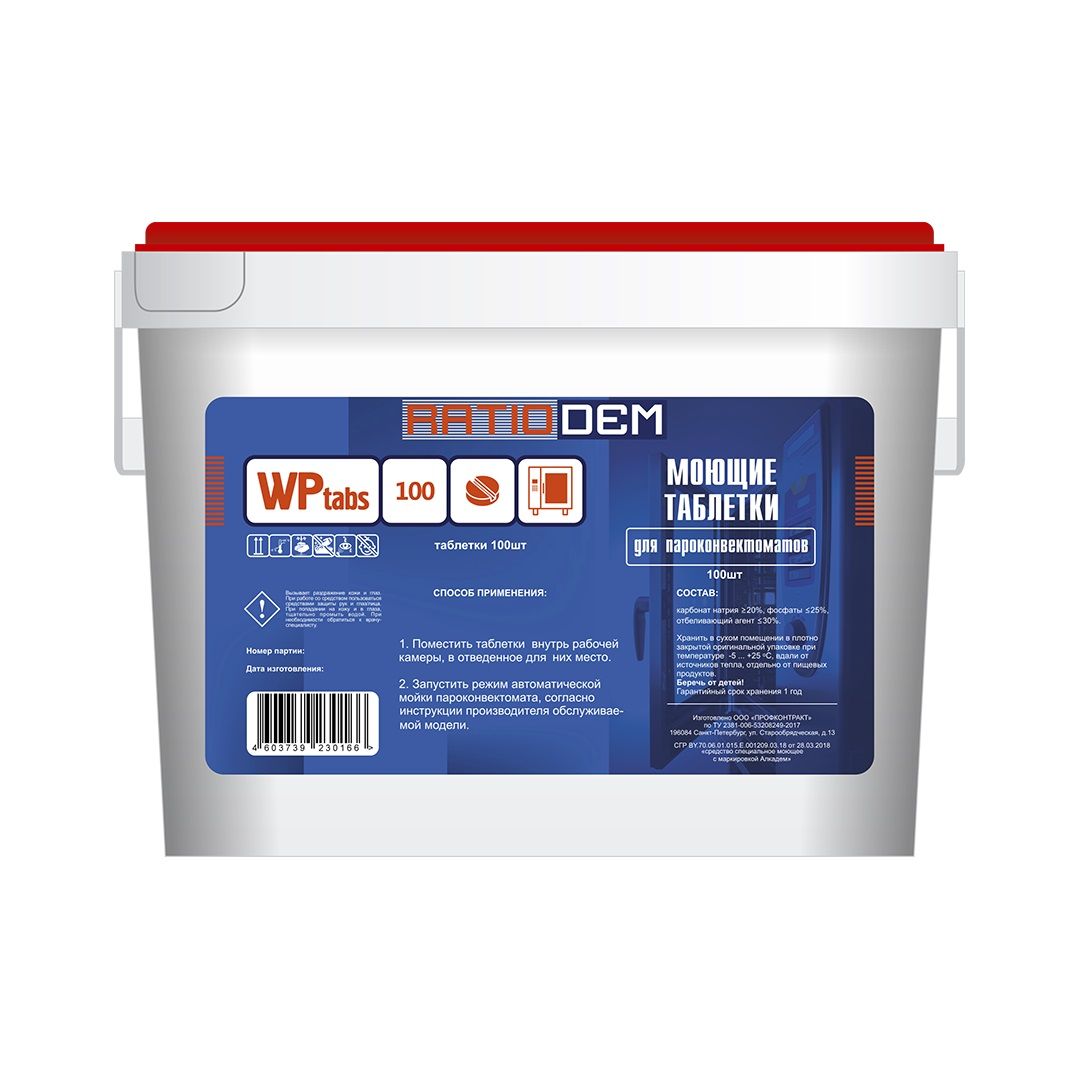ДЛЯ RATIONAL Средство моющие таблетки для пароконвектоматов (щелочное средство). 100 табл.Обеспечивают чистку рабочей камеры от органических загрязнений и пригаров. В зависимости от степени загрязнения для очистки требуется от 1 до 6 таблеток.RatioDem WP tabs 100, pH - 11,5-12,5Состав: гидроксид натрия 15-30%; комплексообразователи 5-15%; неионогенные ПАВ < 5%