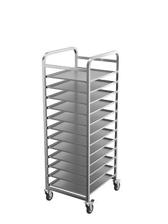 530х600х1575мм, количество уровней 12, для подносов 470х580мм, расстояние между уровнями 113, максимальная распределенная нагрузка общая 160кг, максимальная распределенная нагрузка на одну полку 15кг. Профиль стоек труба 25х25мм, материал стоек нерж. сталь 1,5мм. Колесная опора без тормозов 2шт., колесная опора с тормозом 2шт. Диаметр поворотных колес 100мм. Вес 18.7кг.
