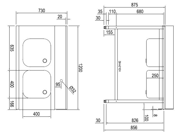 Спец. исполнение 1200х730х860мм., 2 ванны 400х400х250мм, бортик, левый.