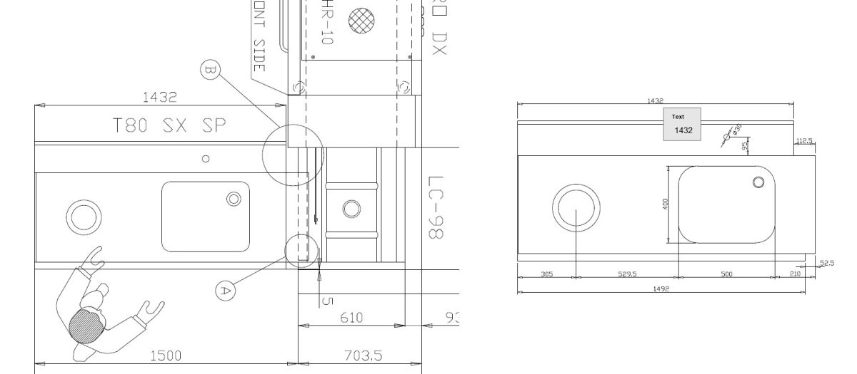 1492х730х850 мм, бортик, полка, ванна 500*400*300, отверстие д/отходов, левостронний. Спец. версия с выемкой для соединения с DIHR LC98 и работы оператора с той стороны, с которой показано на чертеже.