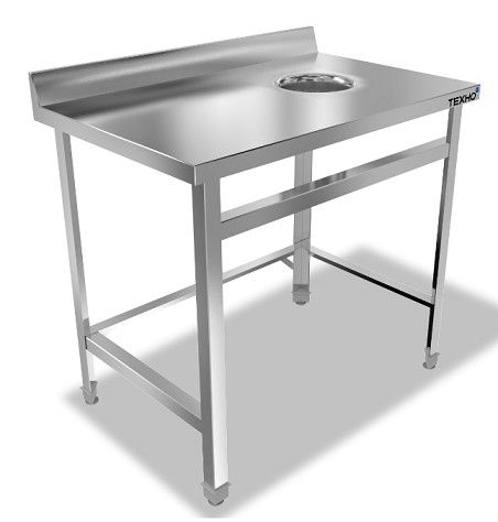 900х600х850мм, Стол для сбора отходов с объемным бортом высотой 70мм, столешница из нержавеющей стали марки AISI 304 толщиной 0,8мм. Каркас разборный из уголка 40х40 толщиной 2мм, покрытого порошковой краской серого цвета. Отверстие O180мм слева. Регулируемые опоры. Стол поставляется в разобранном виде.