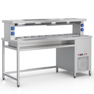 1900х700х1280мм, СФ-190Т стол фасовочный пристенныйс охл. ванной и тепловой пов., Стол фасовочный пристенный с охлаждаемой ванной на 9 GN1/3 глубиной 100 мм и тепловой поверхностью, подсветка, полка.Гастроемкости в комплект не входят.