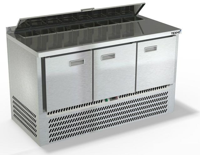 1485х700х850мм, Охлаждаемый стол с бортом высотой 50мм для салатов, с крышкой, нижнее расположение агрегата. Столешница и корпус из нержавеющей стали марки AISI 430. Задняя панель и дно из оцинкованной стали. 3 двери. Температурный режим +2...+10, напряжение 220В, мощность 220Вт, внутренний объем стола 340л, в зону под гастроёмкости помещается 7 GN 1/6 глубиной 150мм, полезный объём стола 210л. Компрессор (Испания). Хладон R-134. Петля доводчик (Польша). Полка решетка регулируемая по высоте с шагом - 45мм, гастронормированная, нагрузка 35кг. Нога опорная, регулировка 25мм. Поставляется в собранном виде.