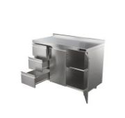 1000х700х870 мм, 1 борт, нагрузка на столешницу 107кг, нагрузка на полку 85кг. Столешница нерж. сталь AISI430 0,8мм, подложка столешницы ДСП 16мм. 2 двери купе. Двери, боковые панели и столешница выполнены из нержавеющей стали AISI430. Дно и задняя стенка выполнены из оцинкованной стали. В комплект стола входит полка, усиленная ребром жесткости. Наличие полки позволяет увеличить полезное пространство в столе размещая на ней посуду, инвентарь, столовые приборы и сухие виды продуктов. Регулируемые ножки 20мм. Вес 56,7кг.