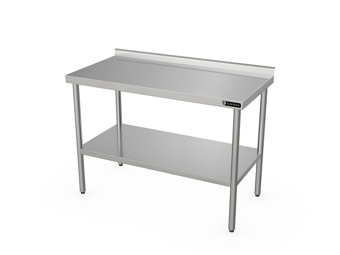 900х700х870мм, нагрузка на столешницу 94,5кг, 1 борт, столешница нерж. сталь AISI430 0,8мм, подложка столешницы ДСП 16мм, толщина столешницы – 50 мм. Ножки круглая труба диаметр 40мм, нержавеющая сталь AISI 201, зеркальная, толщина металла 1,5мм. Полка сплошная AISI430. Регулируемые ножки 20мм. Вес 24,9кг. Стойки каркаса с приваренными уголками для крепления столешницы (в верхней части) и уголками для крепления полки на высоте 350 мм от пола (в нижней части). В стойки запрессованы регулируемые по высоте пластиковые ножки, позволяющие изменять высоту стола в пределах 20 мм. Сплошная полка стола выполнена из нержавеющей стали и крепится к уголкам на каркасе. Для усиления прочности снизу полки установлен швеллер. Изделие разборное и поставляется в удобной упаковке, что облегчает транспортировку и хранение.