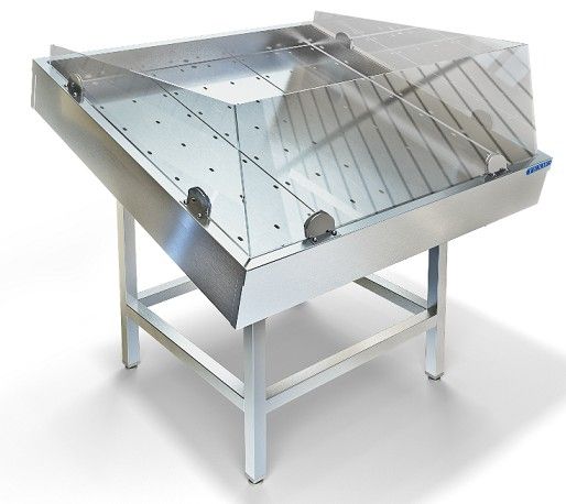 1100х1100х1030мм, Стол для выкладки рыбы на льду без агрегата, ванна из нержавеющей стали марки AISI 304 толщиной 1мм. Каркас регулируемый из нержавеющей стали марки AISI 430 толщиной 0,8мм. Сливные трубки диаметром 20 мм 2шт. Внутри ванны перфорированный поддон из нержавеющей стали марки AISI 430 толщиной 0,8мм для аккумулирования холода. Подставка разборная из трубы 40х40 нержавеющей стали марки AISI 304 толщиной 1,2мм. Регулируемые опоры. Стекло с 3-х сторон. Стол поставляется в разобранном виде.