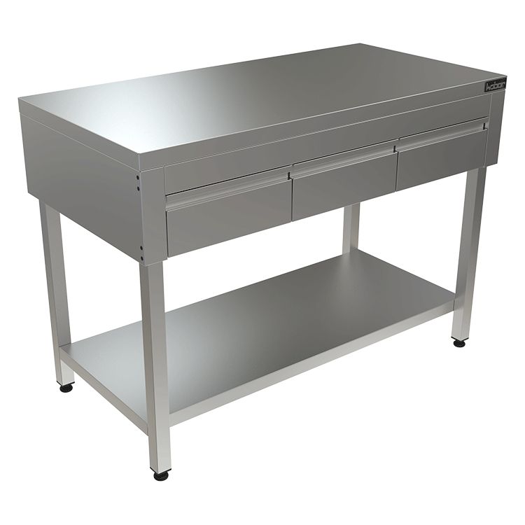 1500х700х870мм, Стол с выдвижными ящиками (столешница – нерж. сталь aisi 430, выдвижные ящики под столешницей, усиление ЛДСП, каркас нерж. труба 40х40, полка, разборный)