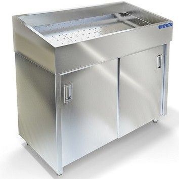 1500х600х1090мм, Стол-тумба для выкладки соков на льду. Ванна из нержавеющей стали марки AISI 304 толщиной 1,0 мм. Облицовка ванны из нержавеющей стали марки AISI 304 толщиной 0,8мм. Сливные трубки диаметром 20 мм 1шт. Внутри ванны перфорированный поддон из нержавеющей стали марки AISI 430 толщиной 0,8мм для аккумулирования холода. Двери-купе, полка. Корпус сварной из нержавеющей стали марки AISI 430 толщиной 0,8мм. Регулируемые опоры. Поставляется в собранном виде.
